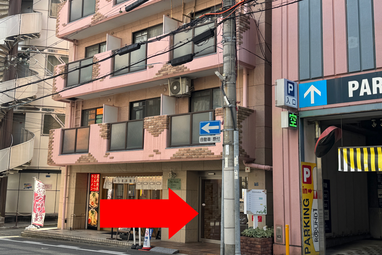 マクドナルドのビルの駐車場入り口の奥にある、ピンクのビル3階に当サロンがございます。